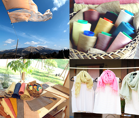 野に咲く春紫苑(ハルジオン)や蓬(ヨモギ)、芒(ススキ)などの草花をはじめ、梅や、杉などの樹木は、草木染めとなって表情豊かに生まれ変わります。
